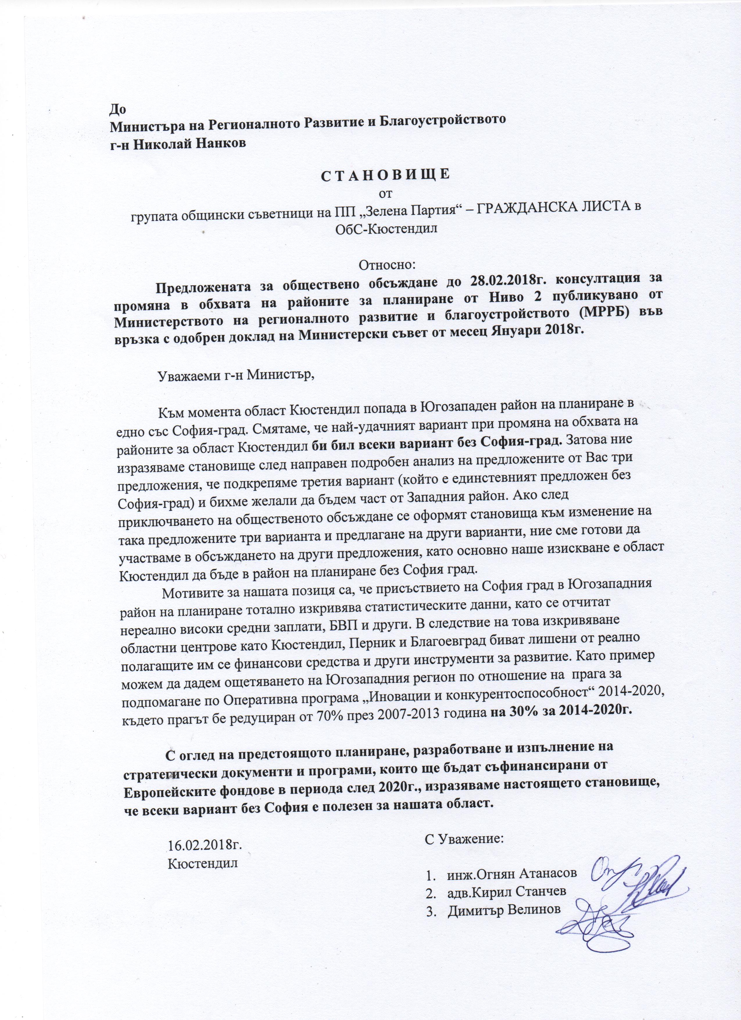 С оглед на предстоящото планиране, разработване и изпълнение на стратегически документи и програми, които ще бъдат съфинансирани от Европейските фондове в периода след 2020г., изразяваме настоящето становище, че всеки вариант без София е полезен за нашата област.